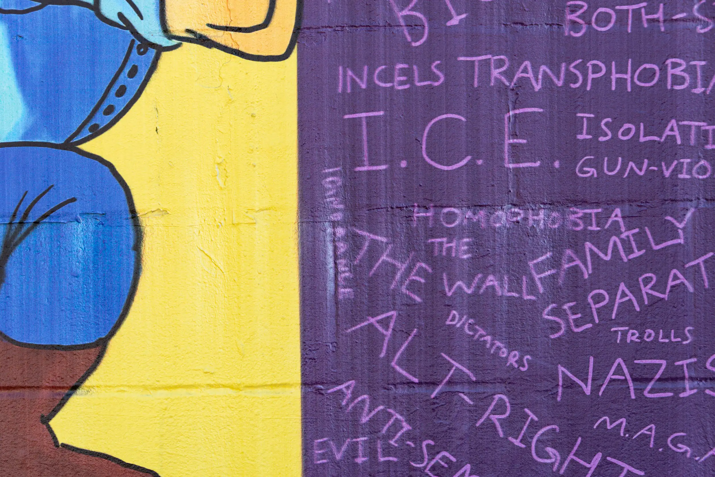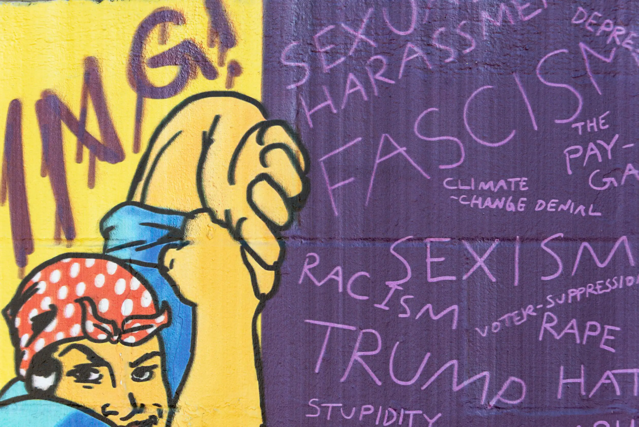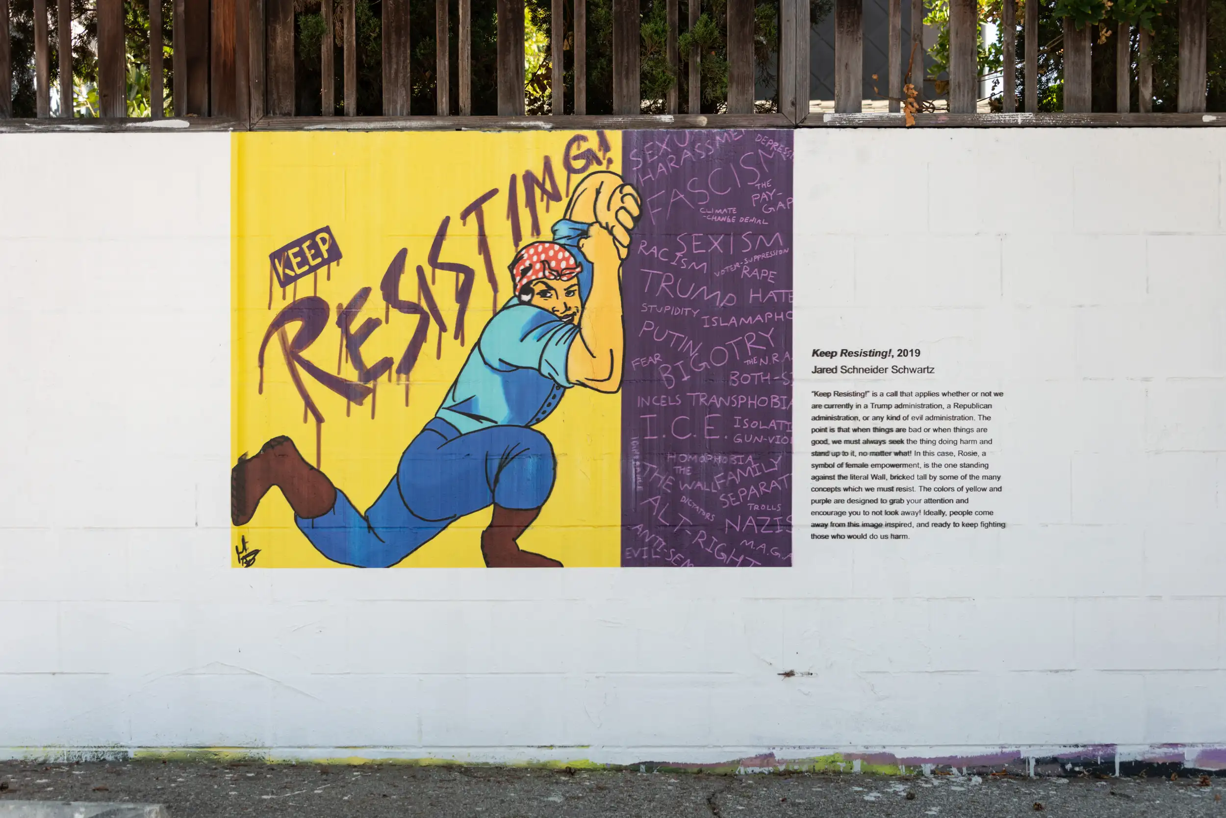 “Keep Resisting!” is a call that applies whether or not we are currently in a Trump administration, a Republican administration, or any kind of evil administration. The point is that when things are bad or when things are good, we must always seek the thing doing harm and stand up to it, no matter what! In this case, Rosie, a symbol of female empowerment, is the one standing against the literal Wall, bricked tall by some of the many concepts which we must resist. The colors of yellow and purple are designed to grab your attention and encourage you to not look away! Ideally, people come away from this image inspired, and ready to keep fighting those who would do us harm.