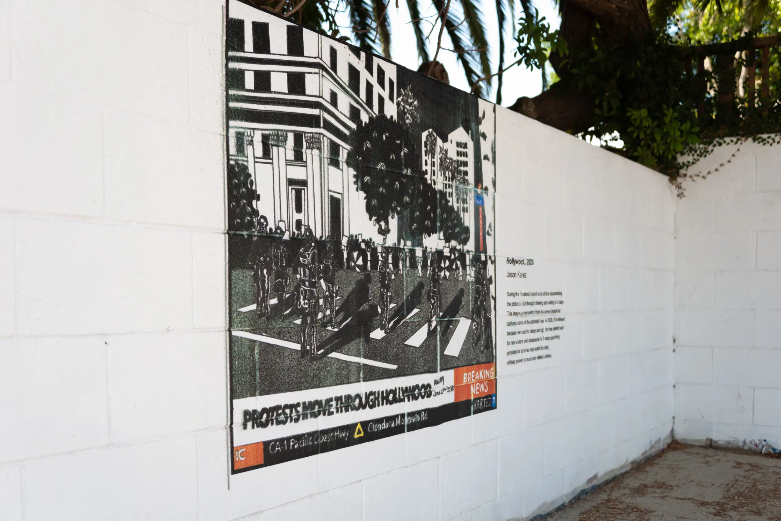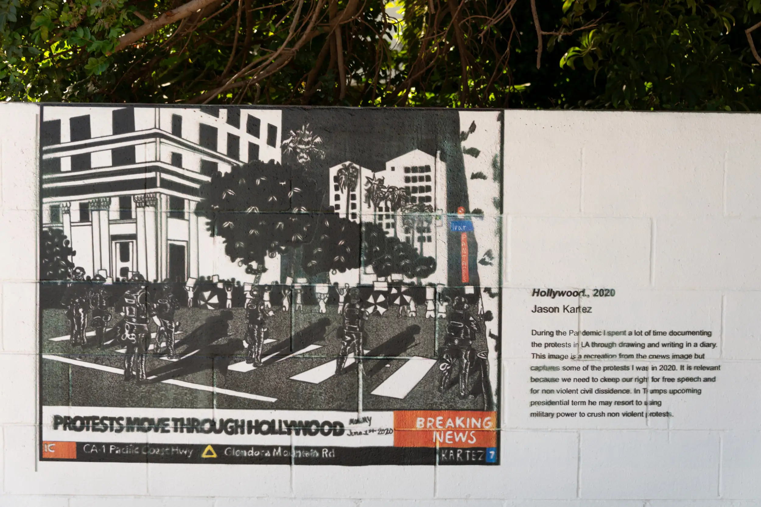 “During the Pandemic I spent a lot of time documenting the protests in LA through drawing and writing in a diary. This image is a recreation from the news image and captures some of the protests I was in 2020. It is relevant because we need to keep our right for free speech and for non violent civil dissidence. In Trump’s upcoming presidential term he may resort to using military power to crush non-violent protests.”